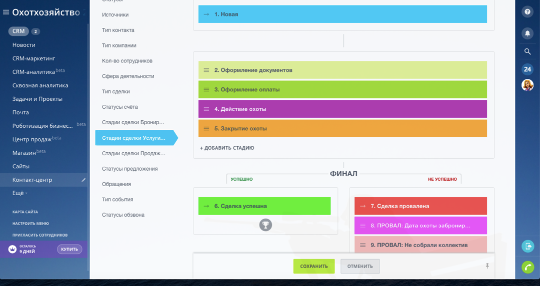 Автоматически выставляются шаблоны следующих документов: Заявление на охоту, договор оказания услуг на охоту, договор аренды домов, счёт на оплату, акт выполненных работ, накладная.